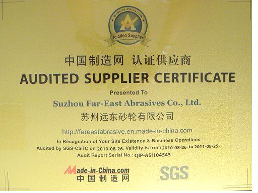 公司全资子公司-----苏州远东砂轮有限公司继被中华人民共和国江苏出入境检验检疫局评为“江苏出口工业产品生产企业分类一类企业”后,经国际知名产品质量控制和技术鉴定权威机构——SGS(通用公证行)评审、考核,远东砂轮公司于近期正式加入“中国制造网(www.Made-in-China.com)认证供应商”行列,成为中国制造网的高级会员。该认证资格的获得,是远东砂轮公司强大综合实力(特别是产品出口、品管体系等方面优势)的有力证明,为使公司成为国际客商首选的合作企业提供了优势平台,从而为远东砂轮公司进一步拓宽国际市场、实现外销上规模再添一份绿色通行证。
